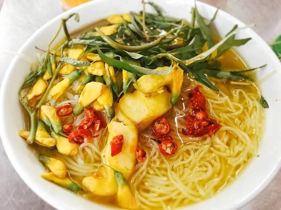 Bạn cho lần lượt bún, cá, ít rau thơm, bông điên điển và sau đó chan nước lèo lên.